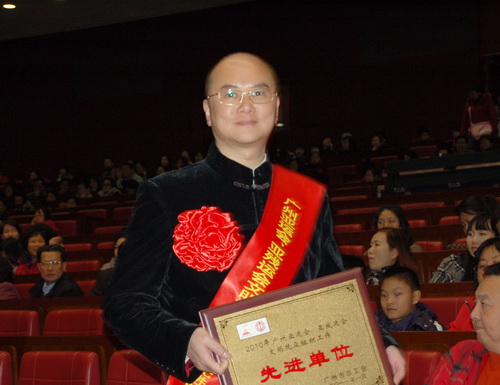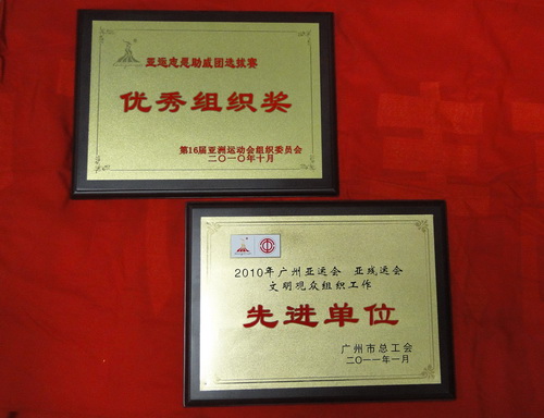 繼亞運期間獲亞組委頒授我司“亞運助威團優秀組織獎”之后,本月15日在廣州白云國際會議中心世紀大會堂,我司獲市總工會頒“亞運亞殘運文明觀眾組織先進集體”獎。工會黃伯強主席披紅戴花,代表我司上臺接受廣州市人大副主任、廣州市工會主席陳偉光親手頒授的獎牌。我司是廣藥系統唯一獲此兩項殊榮的單位。